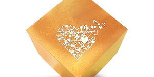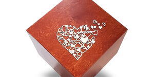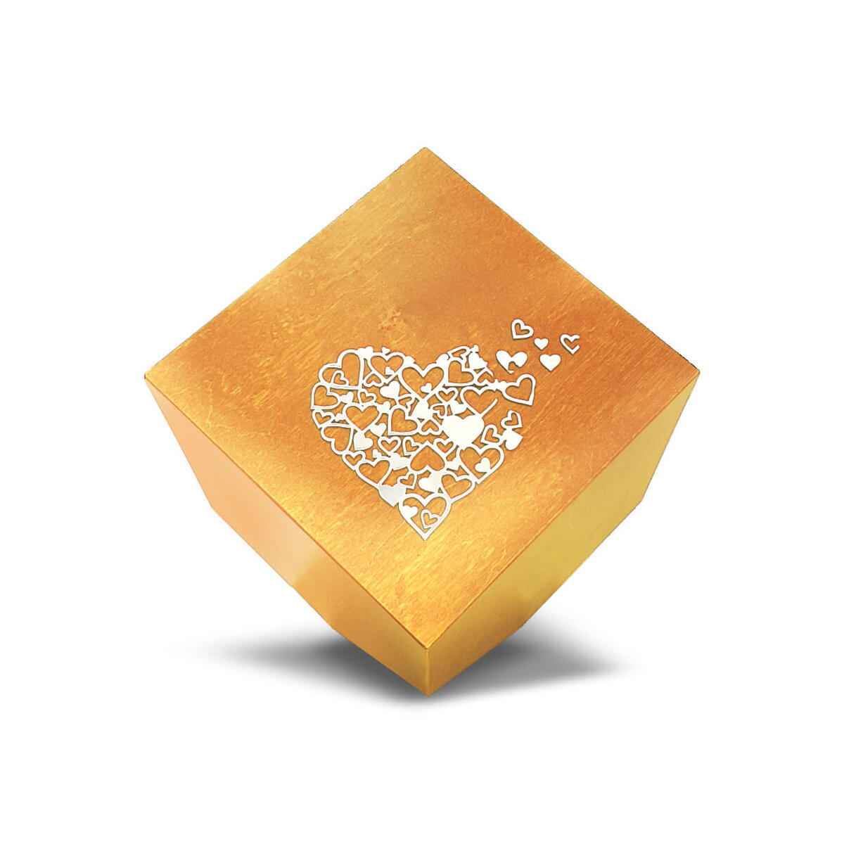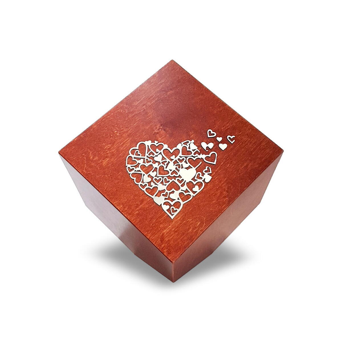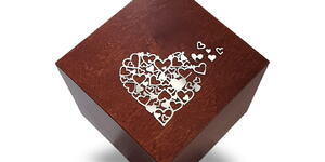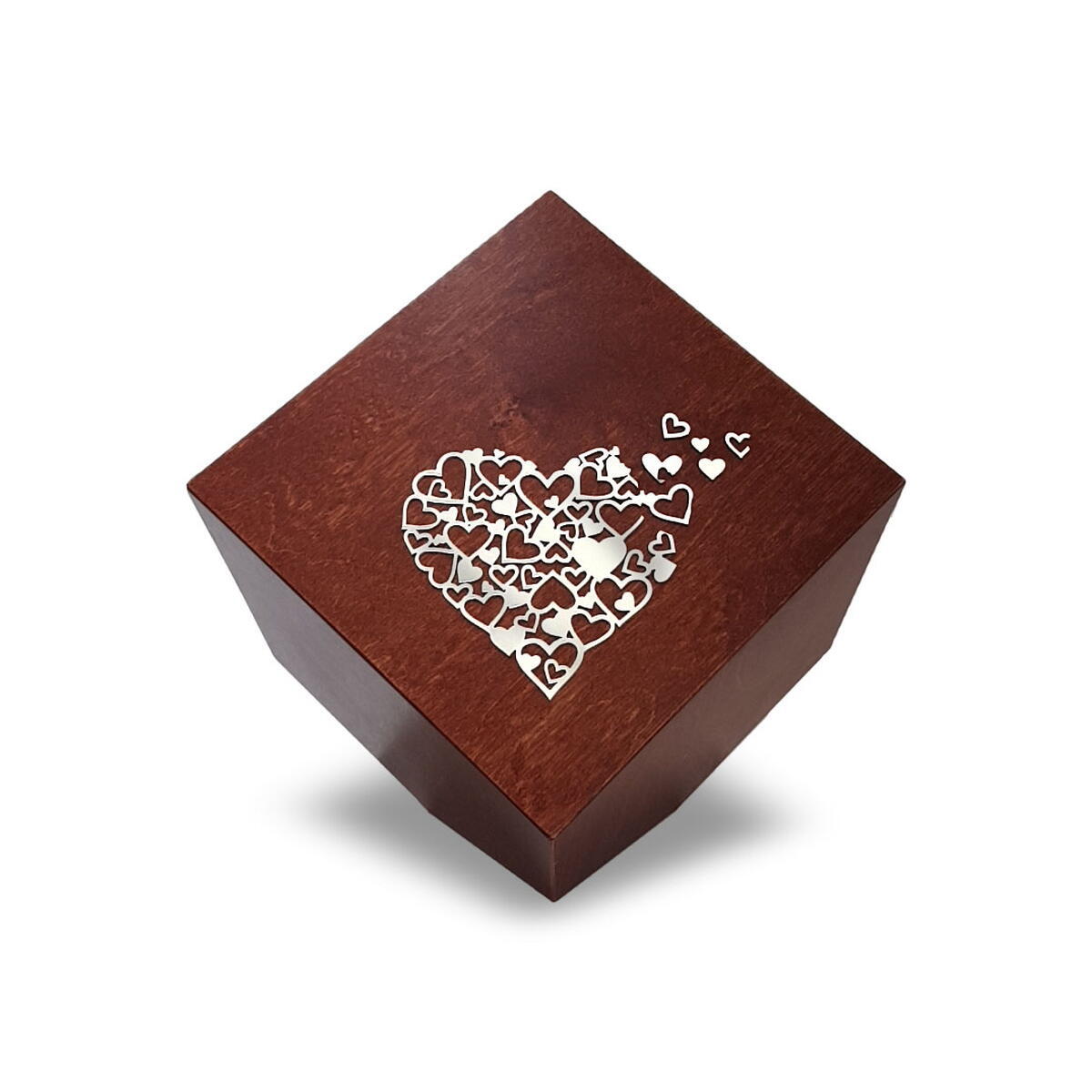 Drewniana urna w formie sześcianu ustawionego na jednym z wierzchołków, przyozdobiona lustrzanym sercem.